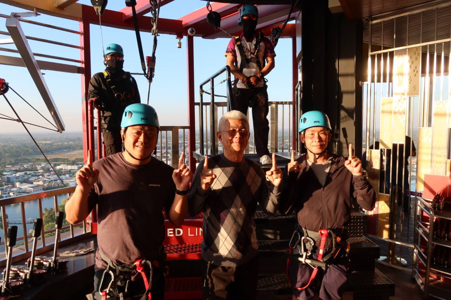 นายกรินทร์ คติกำจร นายกเทศมนตรีเมืองอรัญญประเทศ พร้อมคณะ ขึ้นเยี่ยมชม พร้อมร่วมเล่นเครื่องเล่น Zipline หอโหวด๑๐๑